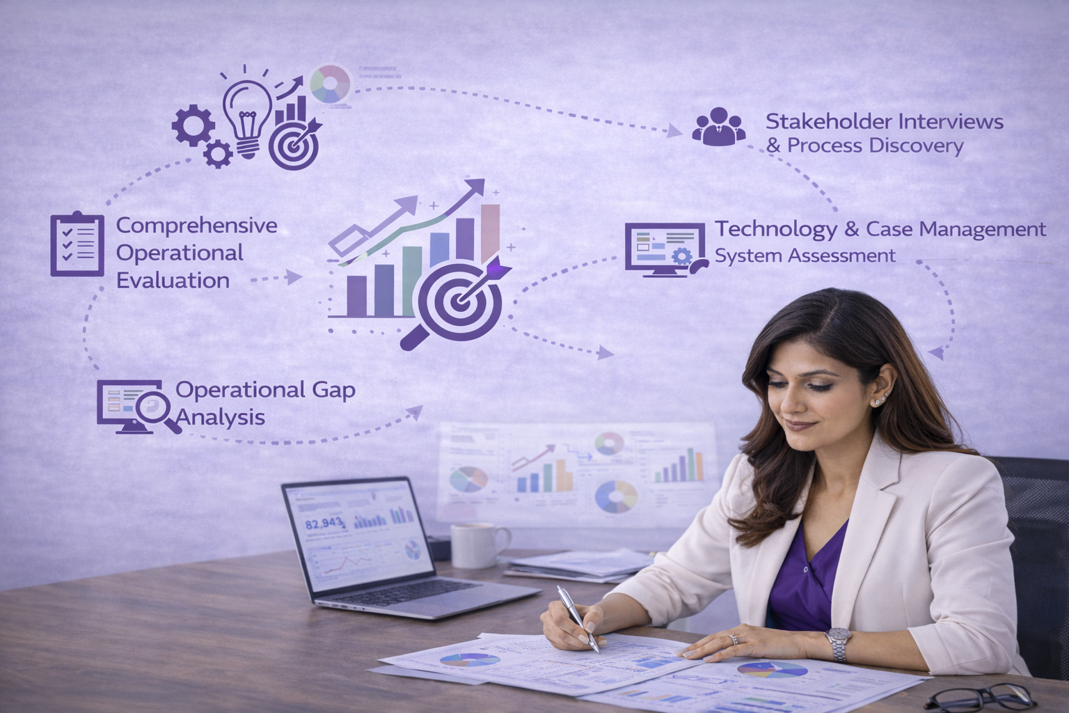 These operational gaps can reduce productivity, increase risk, and limit a firm’s ability to deliver a consistent and high-quality client experience. Our Operational Evaluation & Business Consulting approach focuses on identifying these challenges, providing clear insights into current operations, and delivering a structured roadmap that enables firms to improve efficiency, strengthen operational control, and scale with confidence.